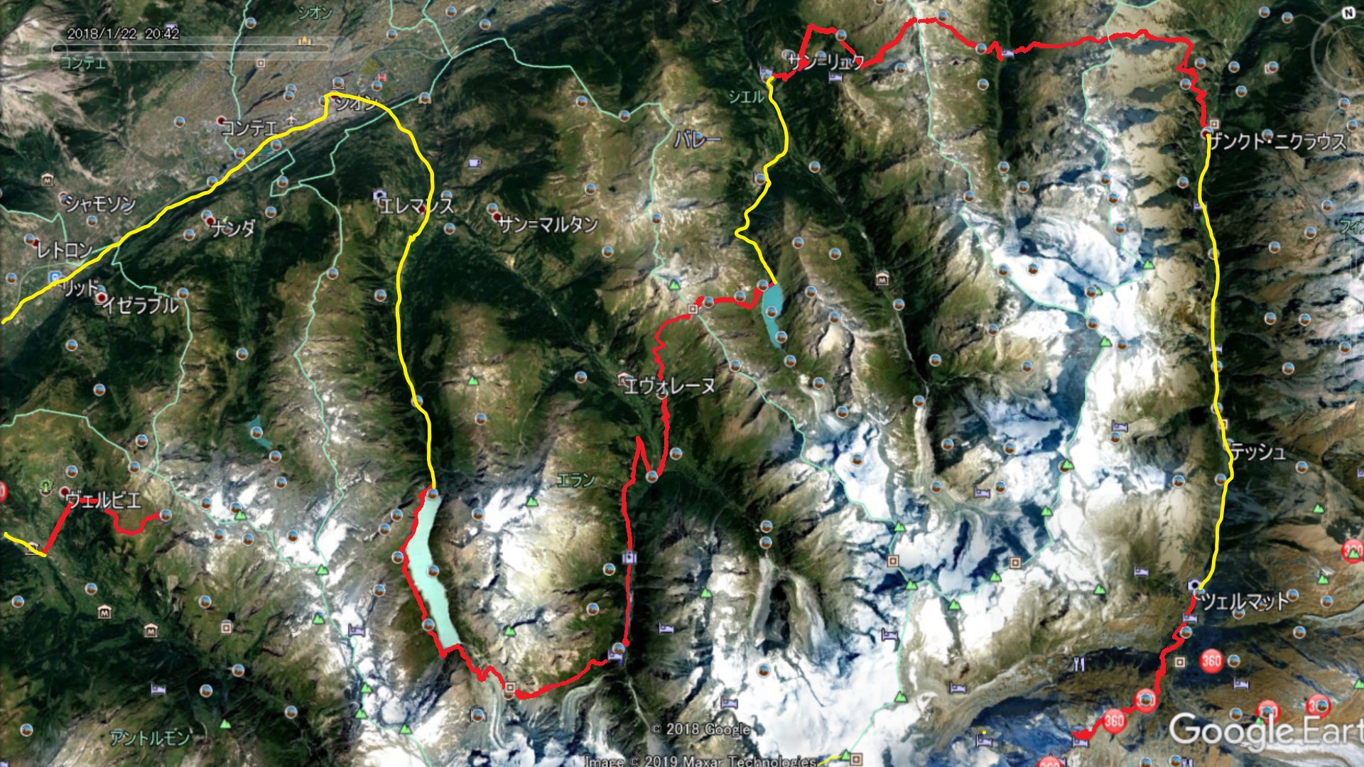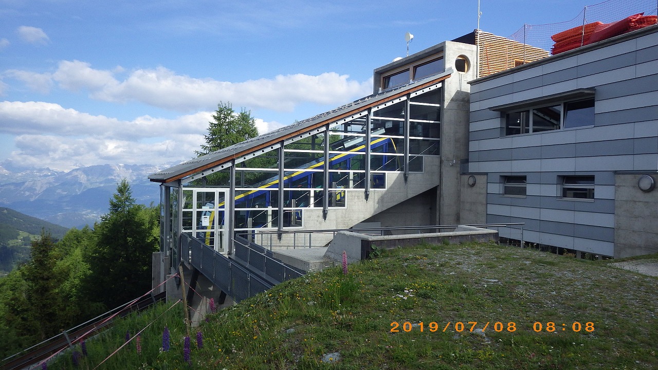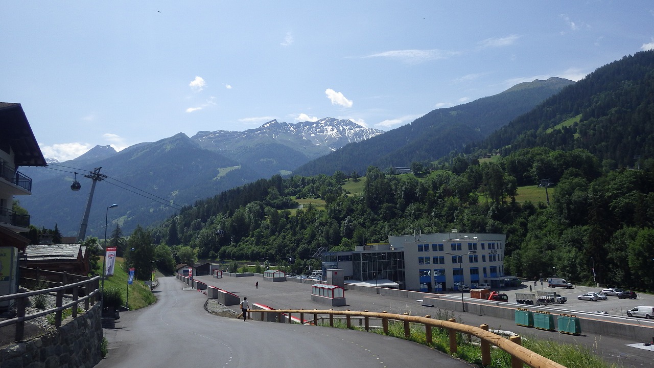 | Sionバスターミナル。バスは川沿いに進んで行き谷が迫ってくるに従い左岸の急斜面を ジグザグに登って行く。Heremenceからも尾根上にHRまでのトレールが繋がっている。 |