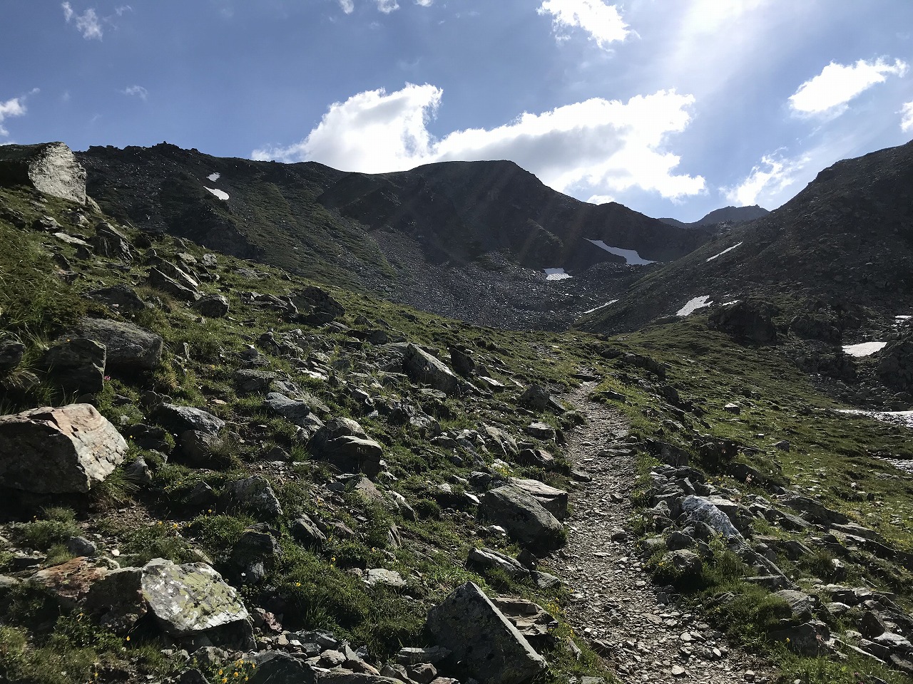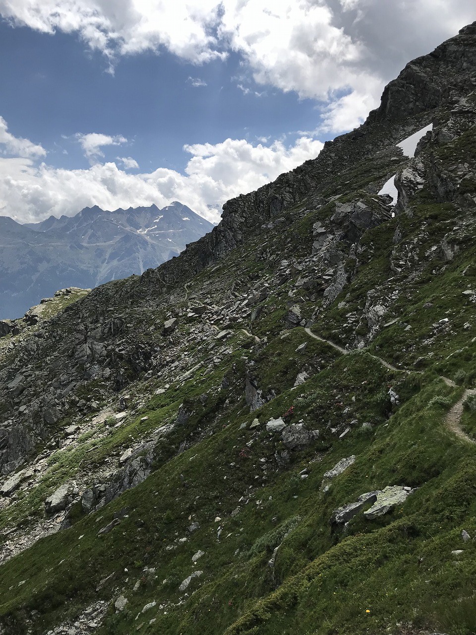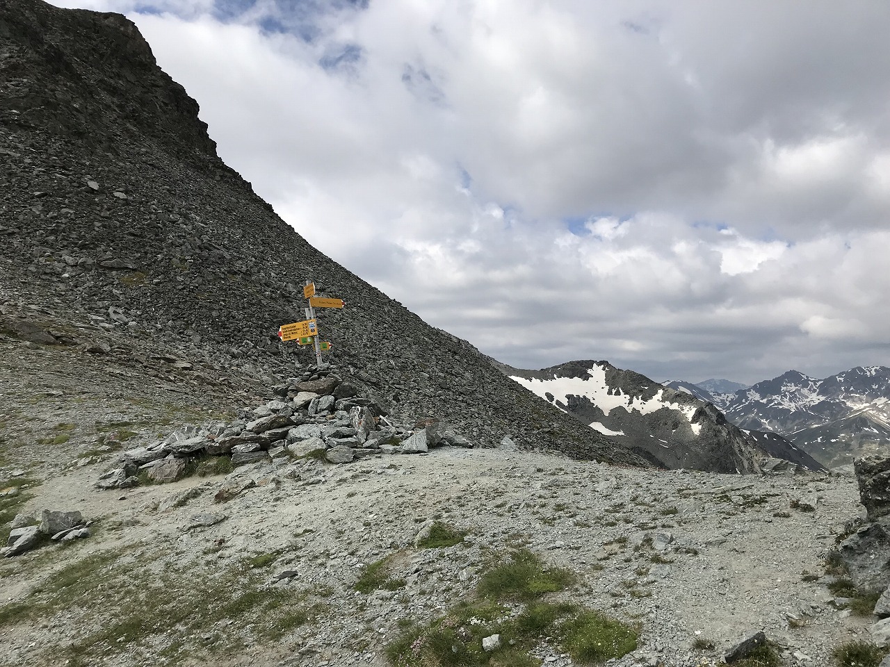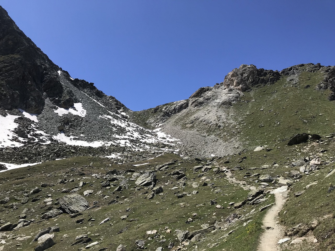 | 視界の開けたアルプ地帯を過ぎるとガレ場地帯になる | Augstbordpass手前の最後のガレ場 | |