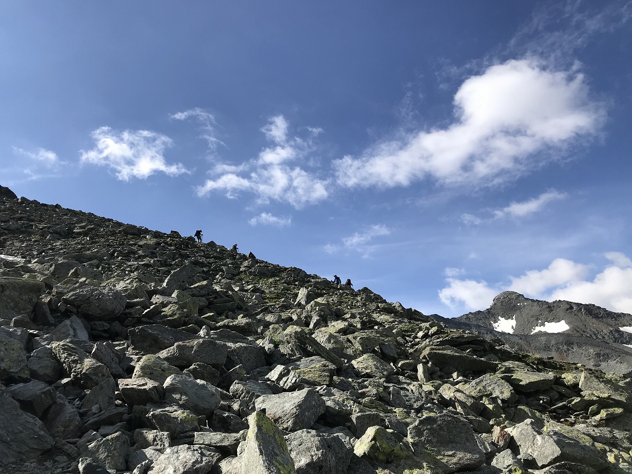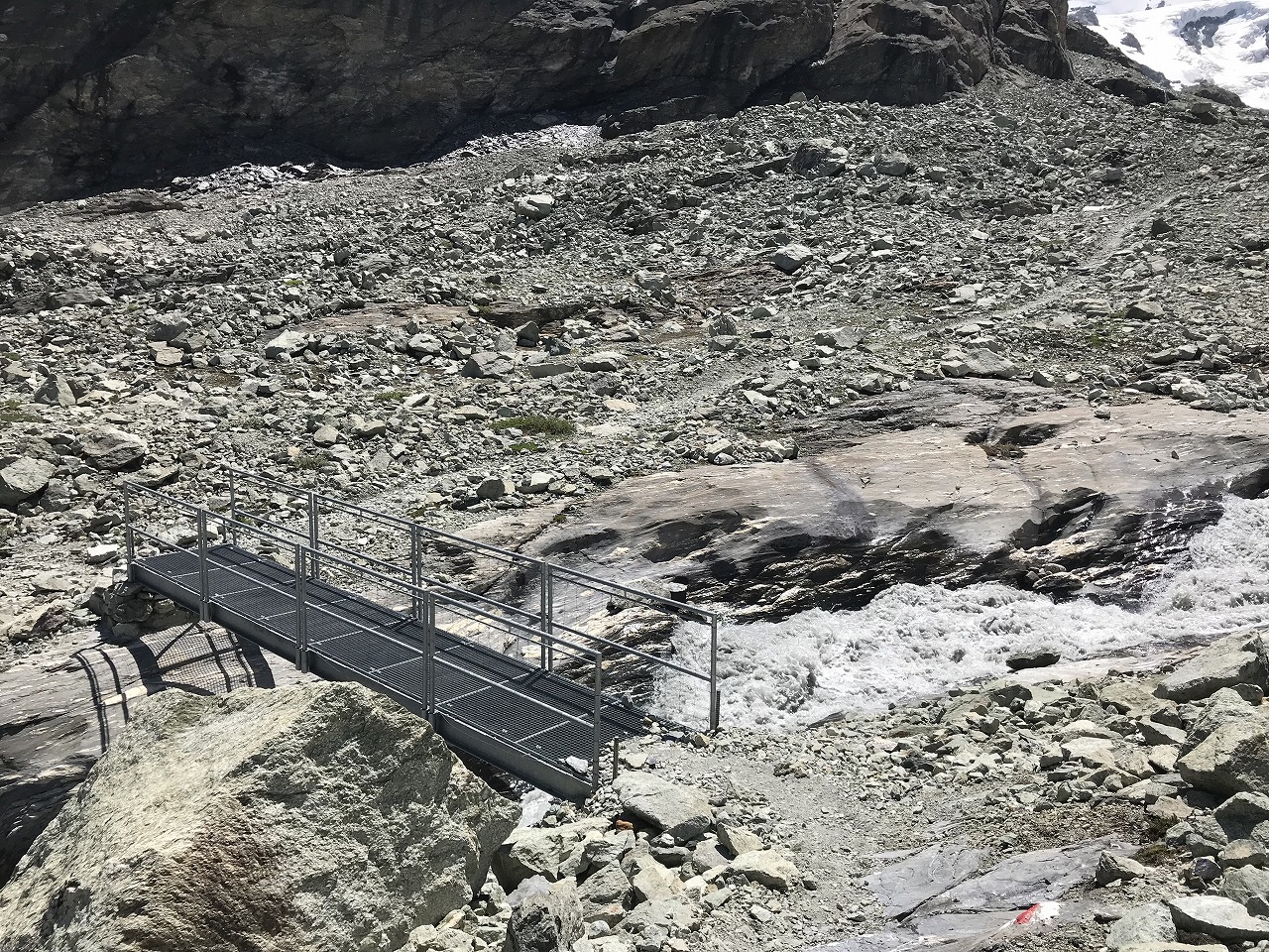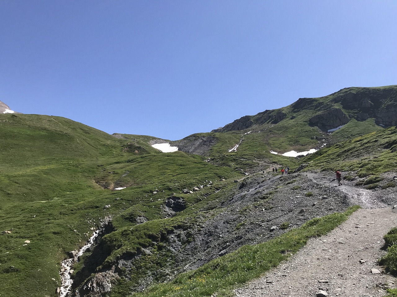 | 視界の開けたアルプ地帯を過ぎるとガレ場地帯になる | Augstbordpass手前の最後のガレ場 | |