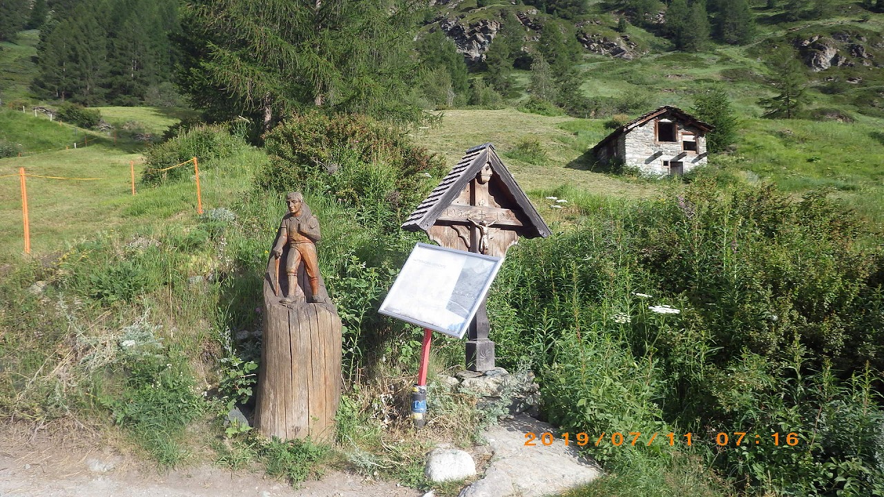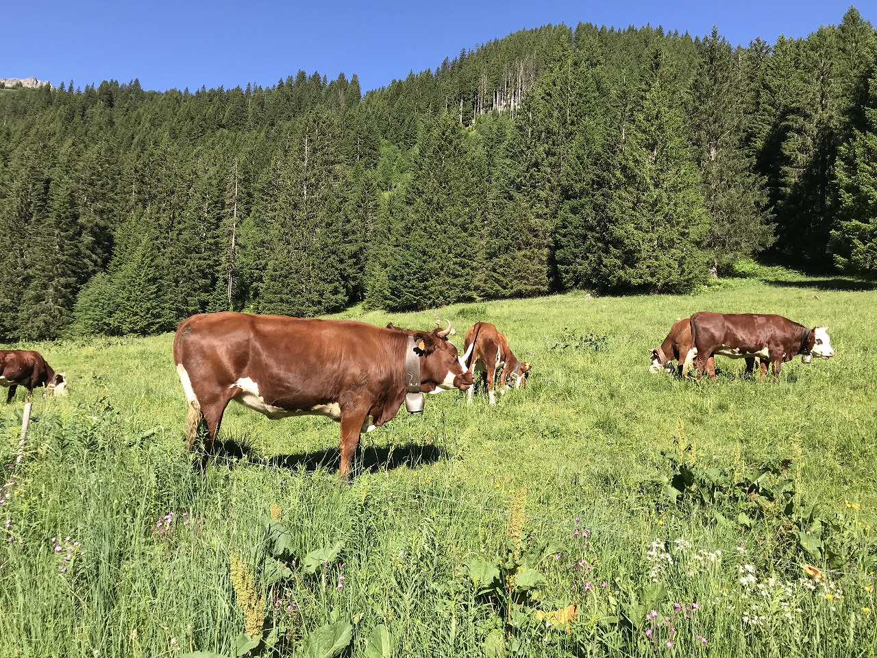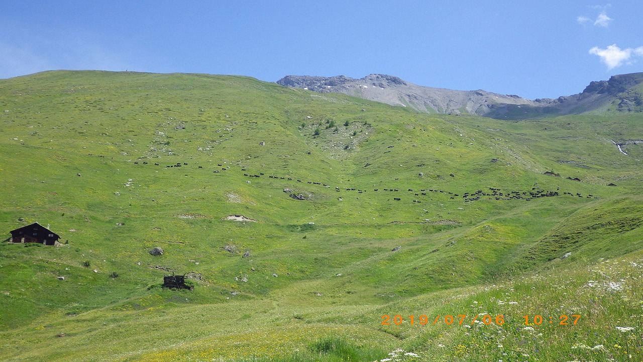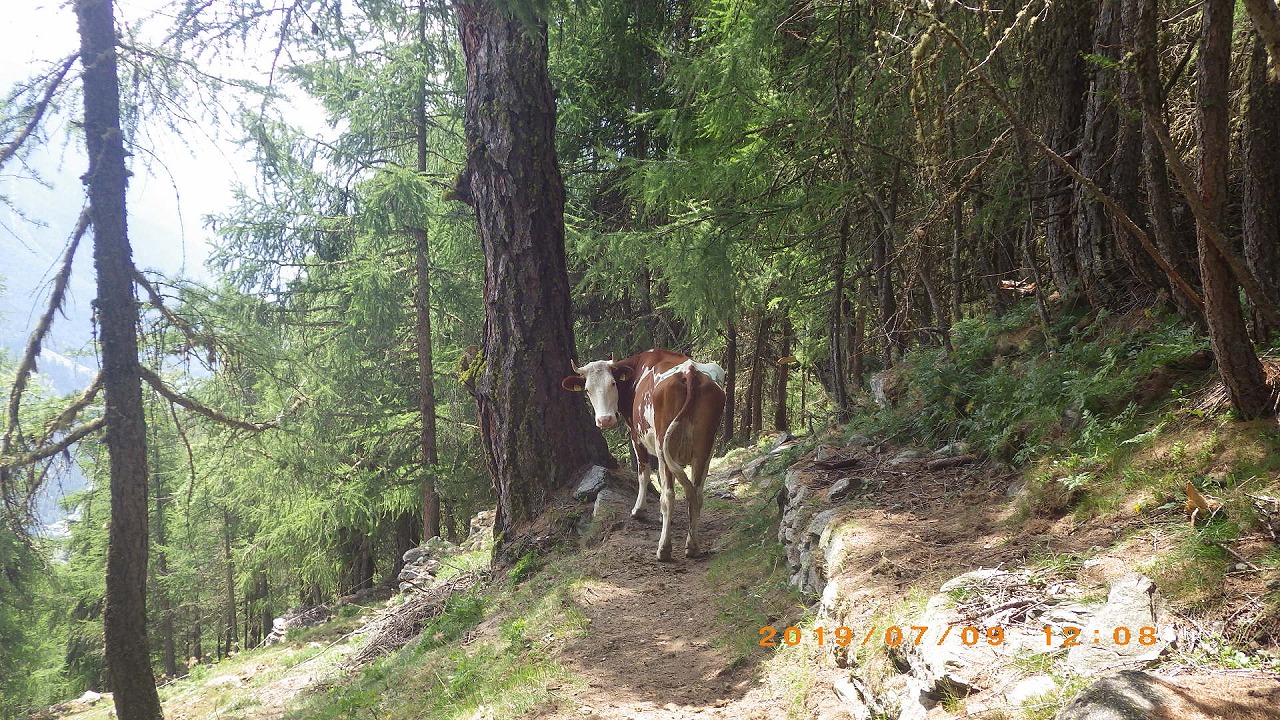 | だいぶ下まで降りてきたがSt.Niklausまではまだ2hもある | 牛に行く手を塞がれる | |