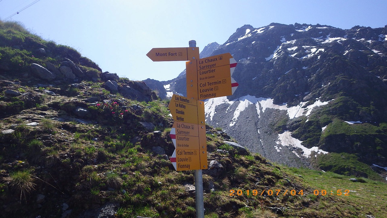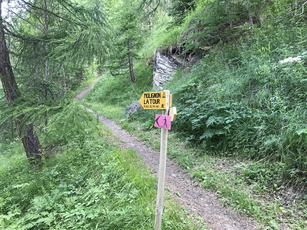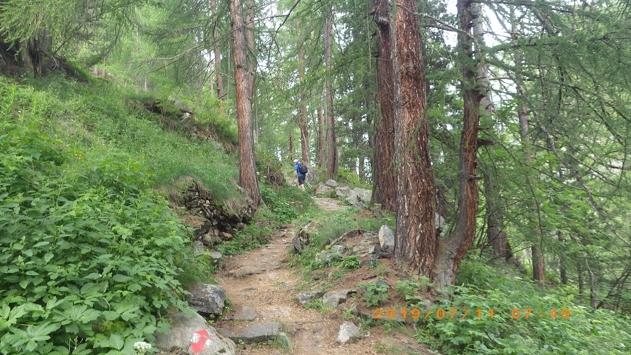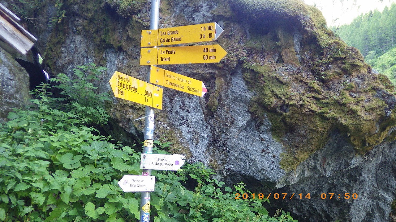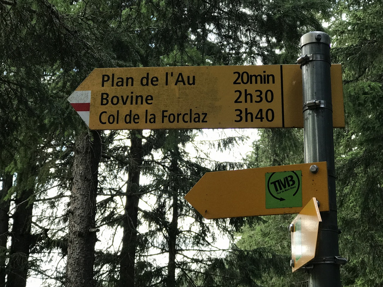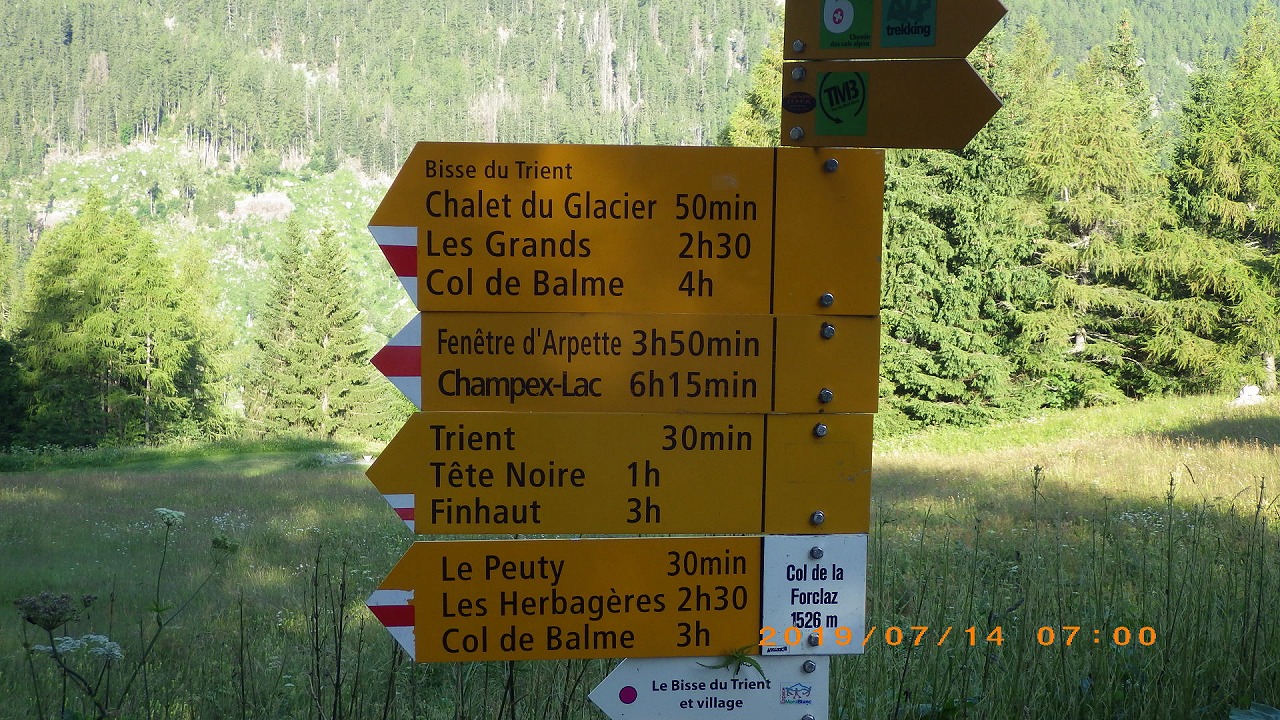 | Col de Forclazまで4h40の表示 | マルチニーを見おろす | 樹林帯を通過 |