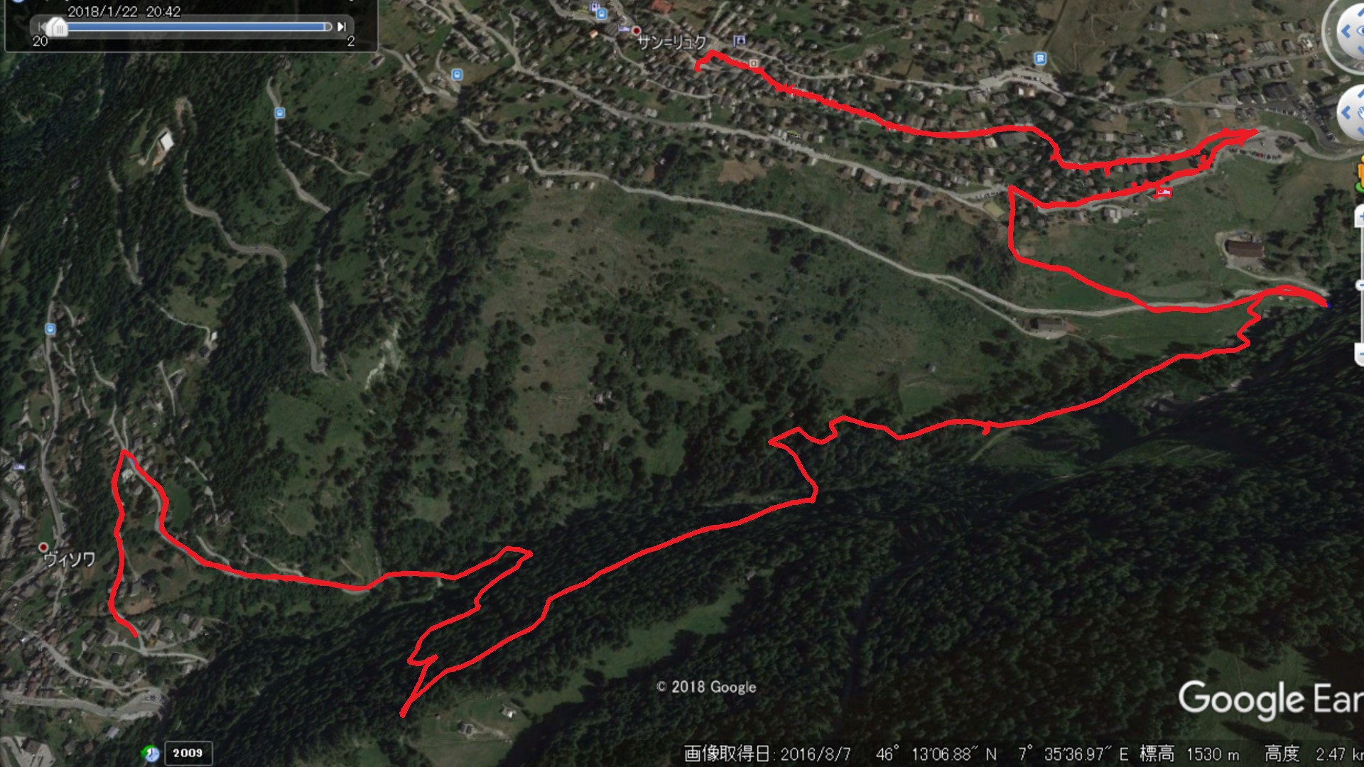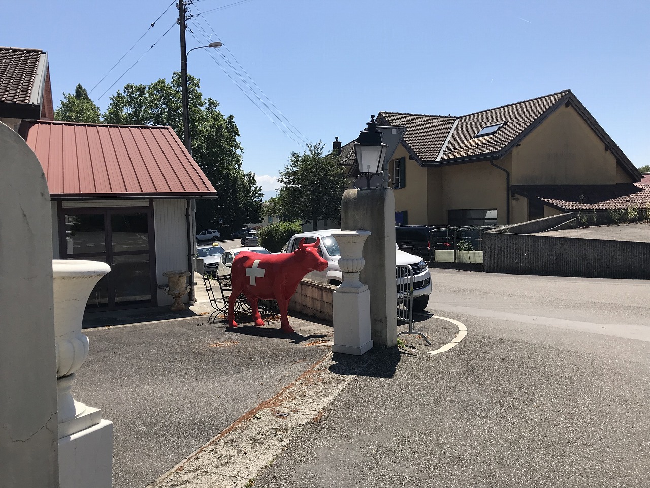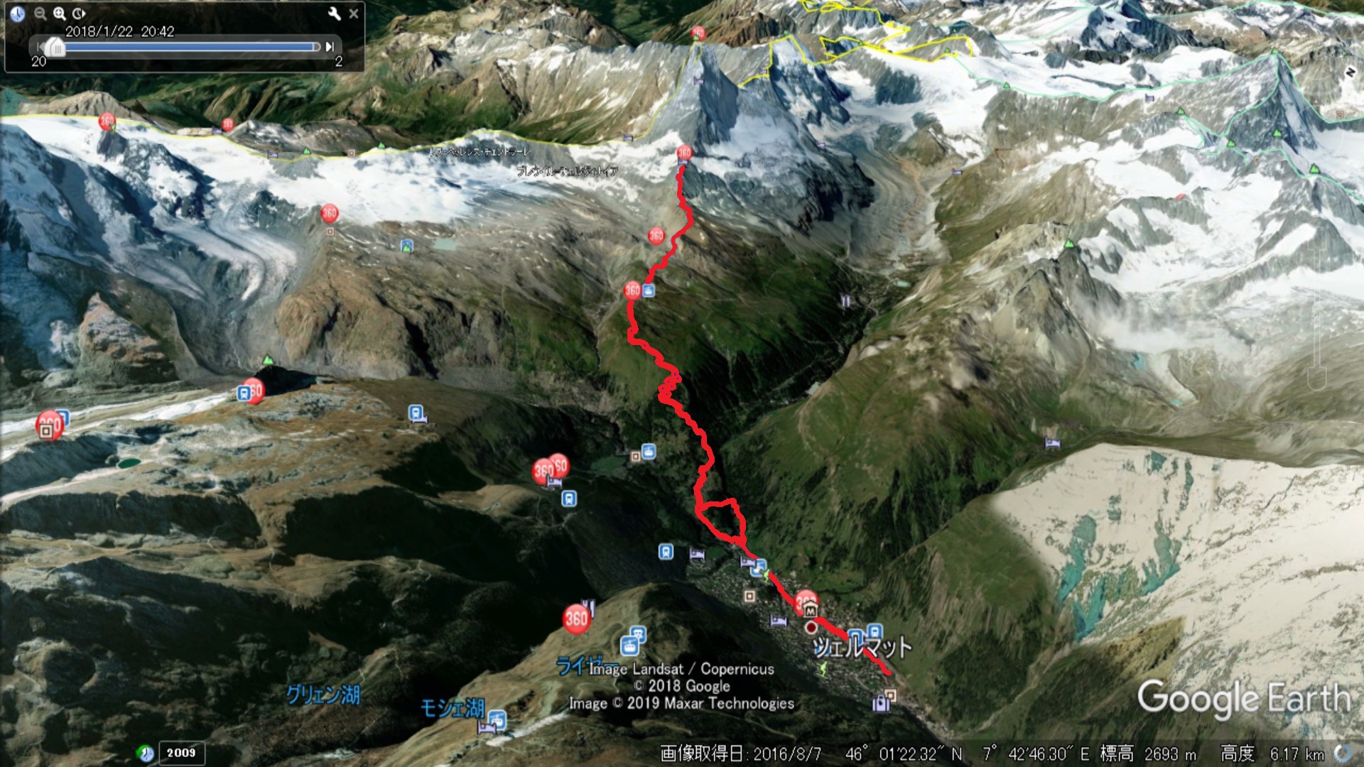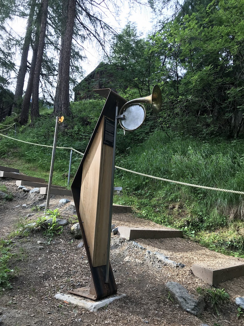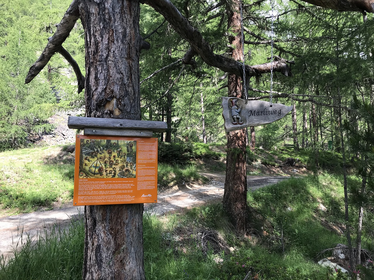 | 惑星がテーマのオブジェが所々にある | ここからから山側に登って行く | 遠くにホテルワイスホルンが見える |
