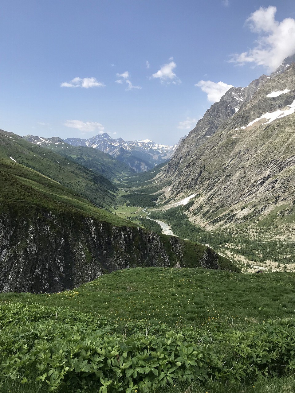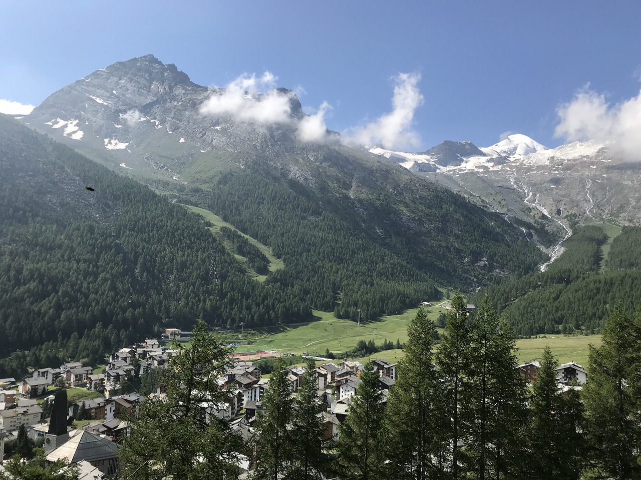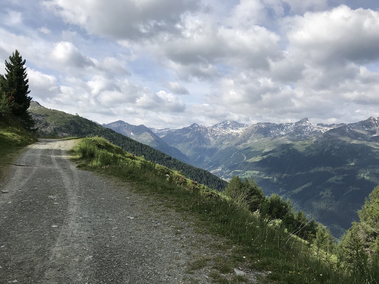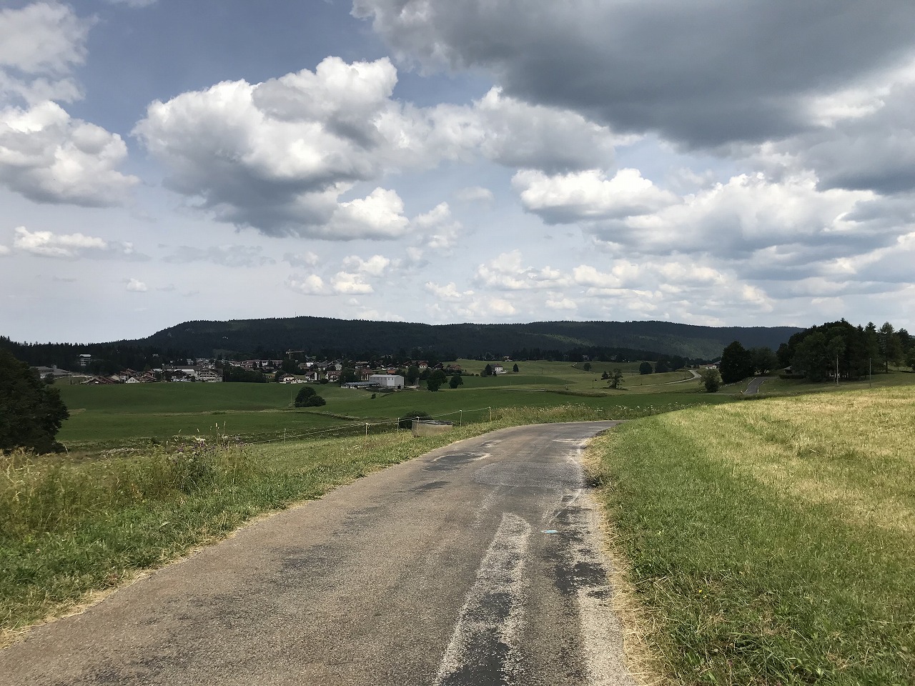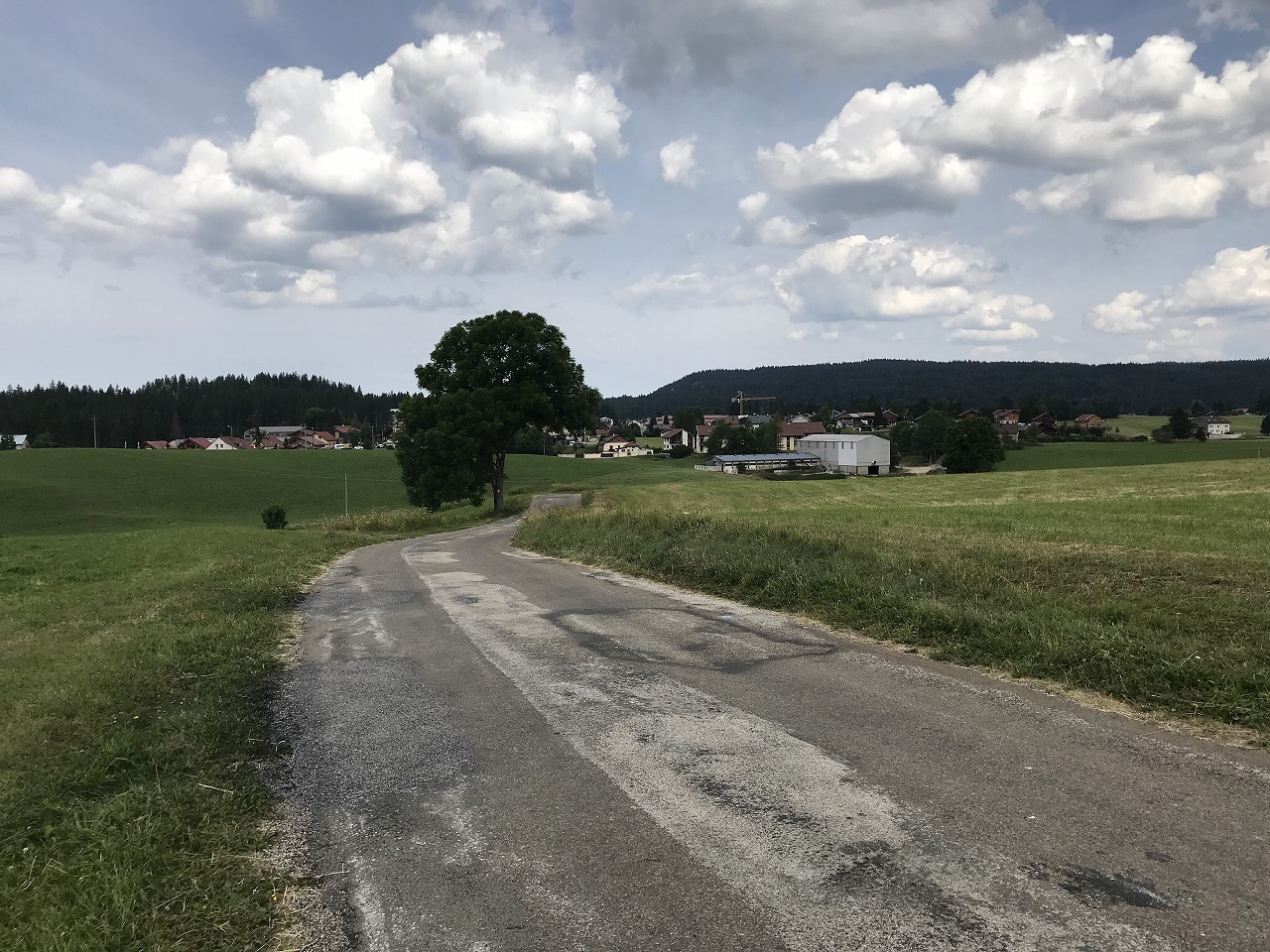 | La Sageの街を抜けると展望が開ける。牛の放牧地アルプが広がる | ||