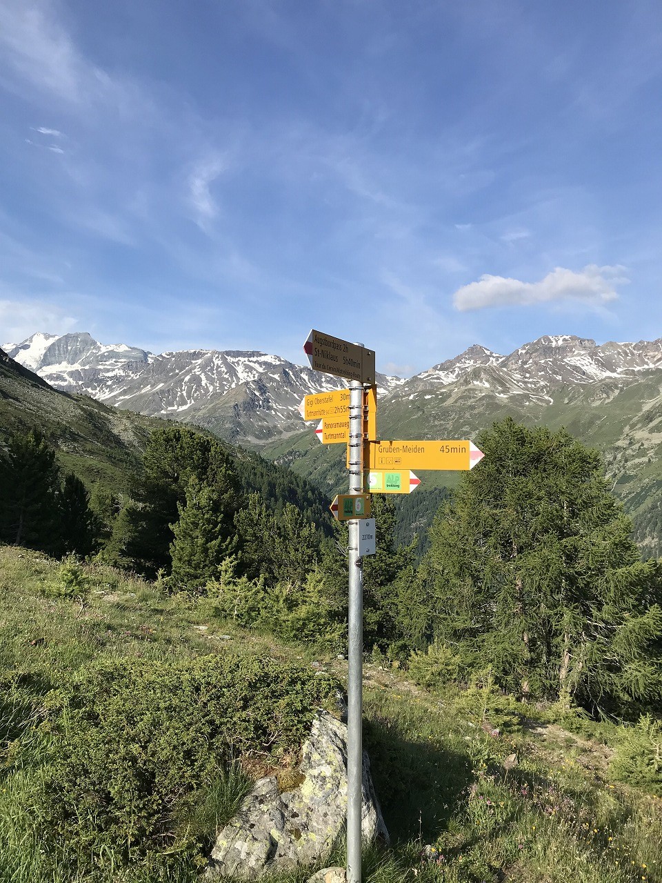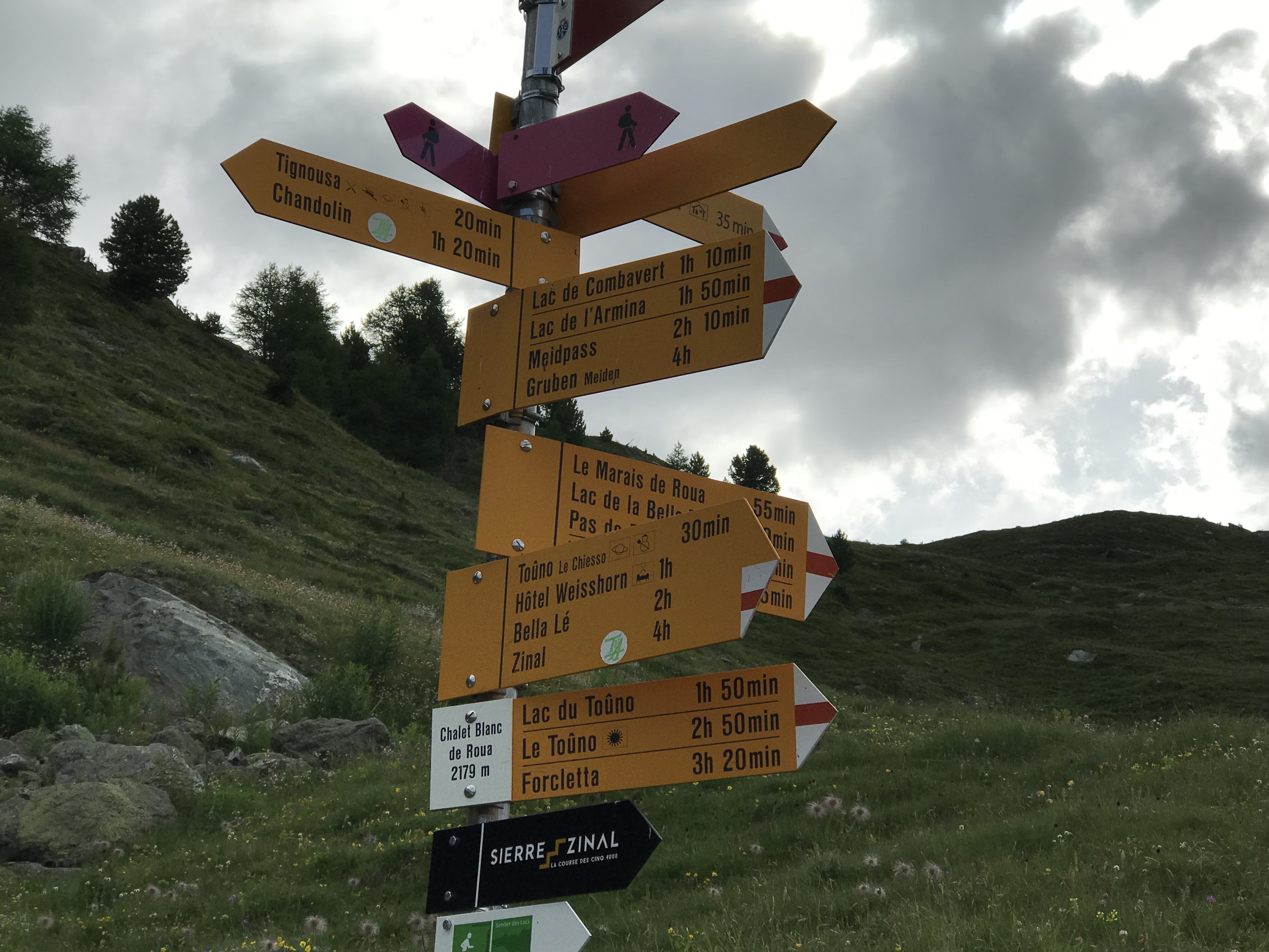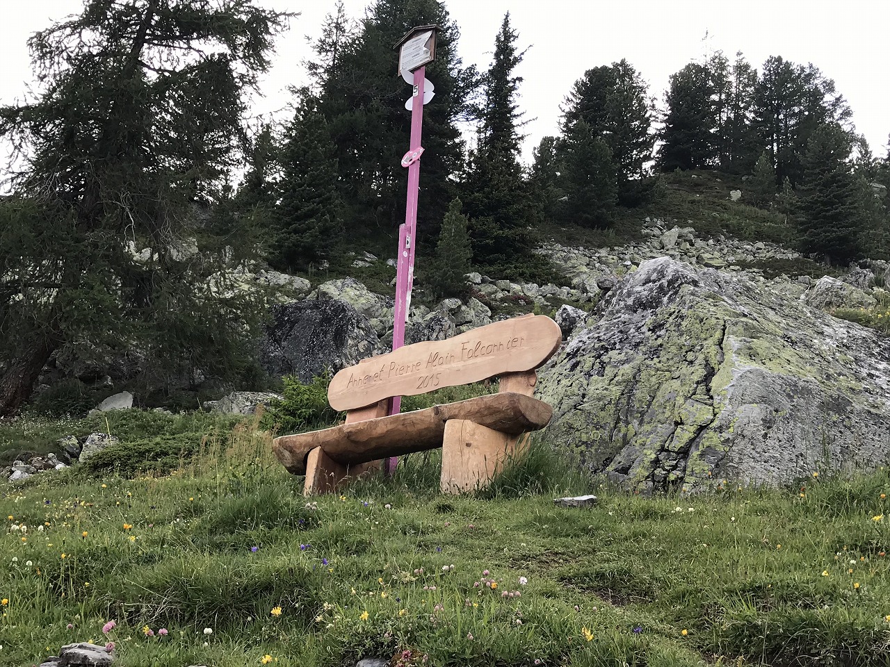 | モンフォール小屋手前にある標識。青色の表示はアルペンルートを意味する | |