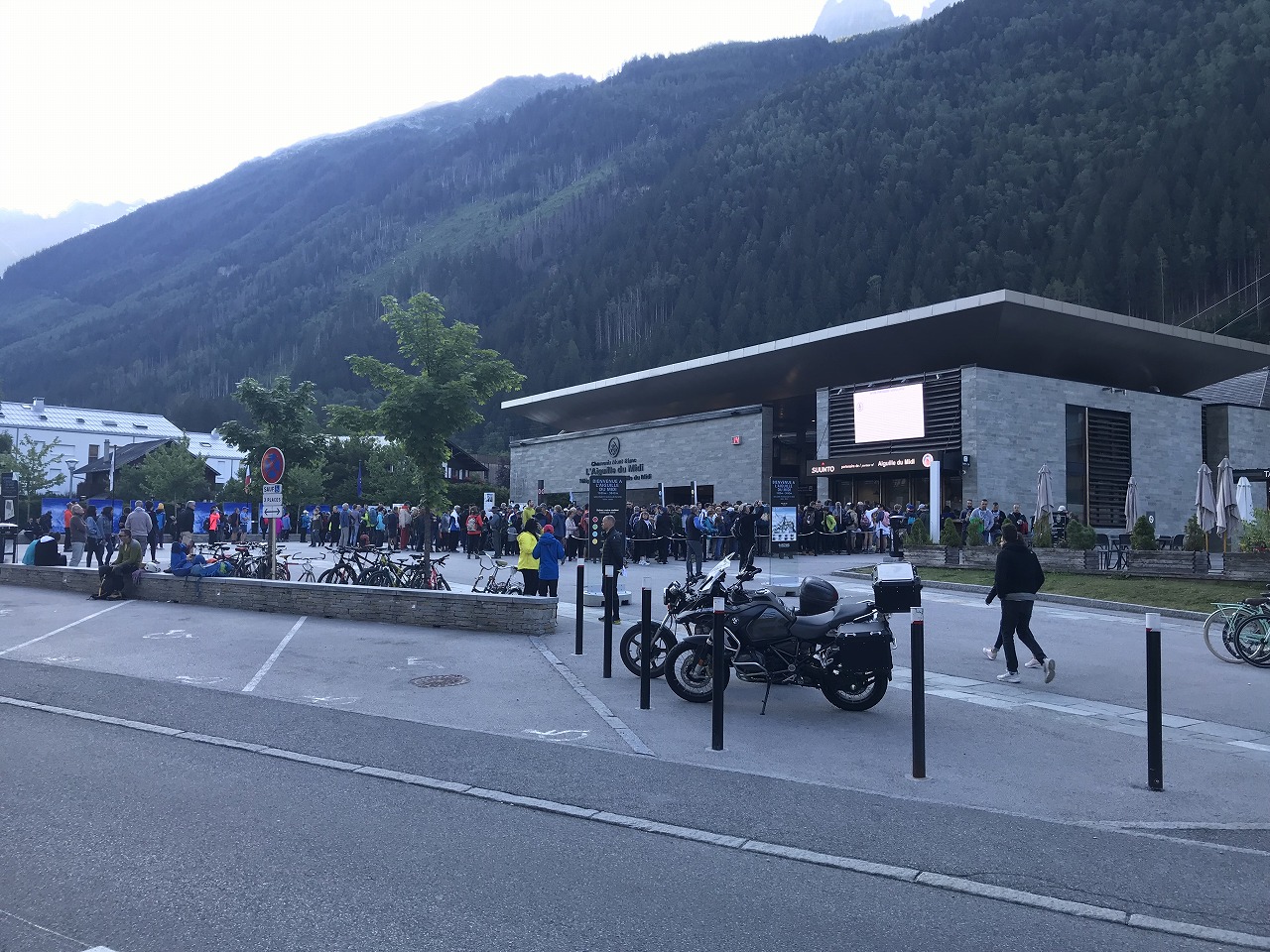 | テレキャビンには自転車用のラックが付いている。テレキャビンを降りた所はパラグライダーやマ ウンテンバイクのスタート地点になっており、見物の人も含めて、沢山の人たちが楽しんでいた。 |