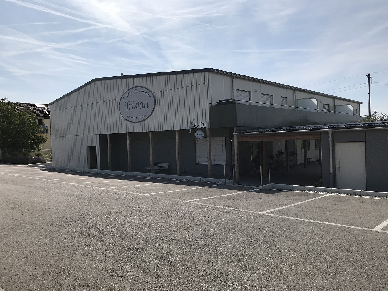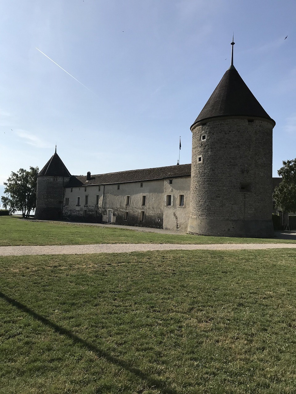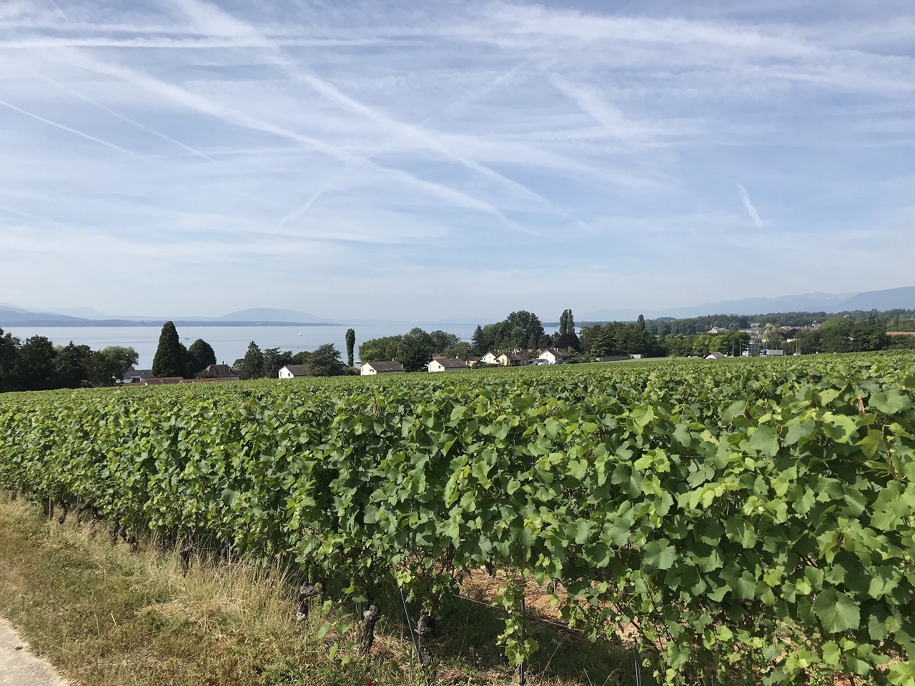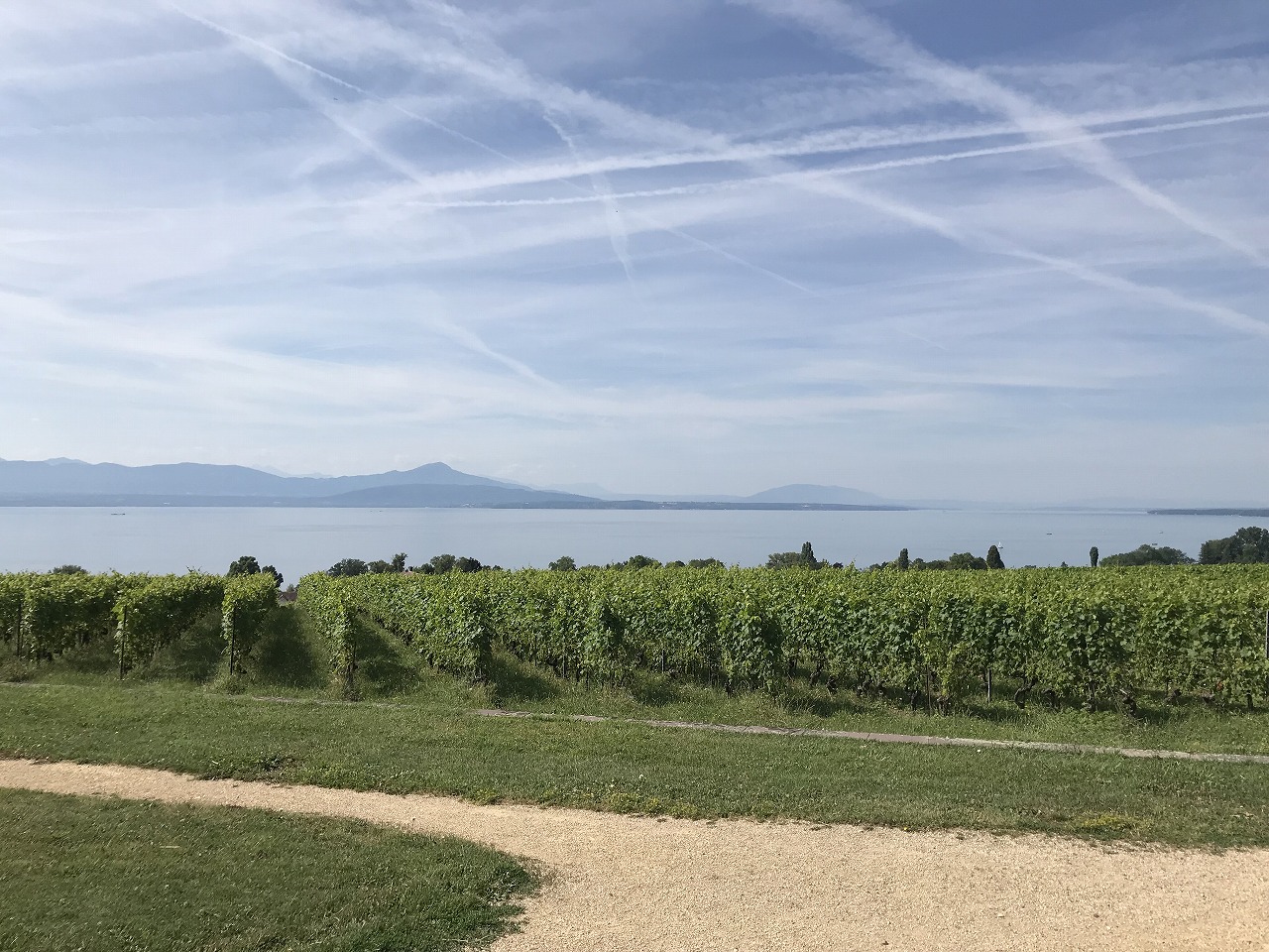 | ワイン畑に囲まれた中を歩いてTristanチョコレート工房まで散歩する。 Geneva空港が近いこともあり、飛行機雲が縦横に空に描かれている。 |
