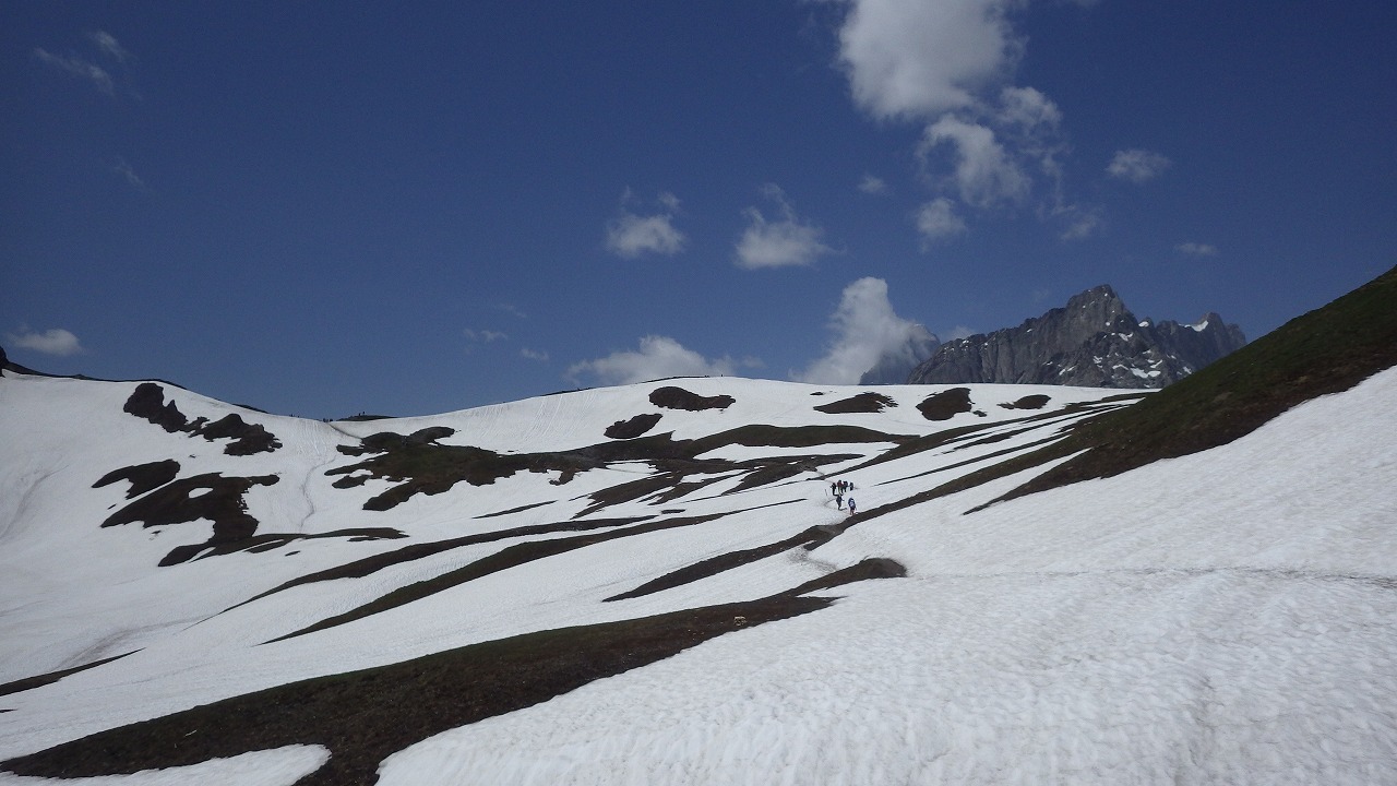 | 大フェレ峠への途中 | 大フェレ峠 | 大フェレ峠からの下り斜面を振り返る |
