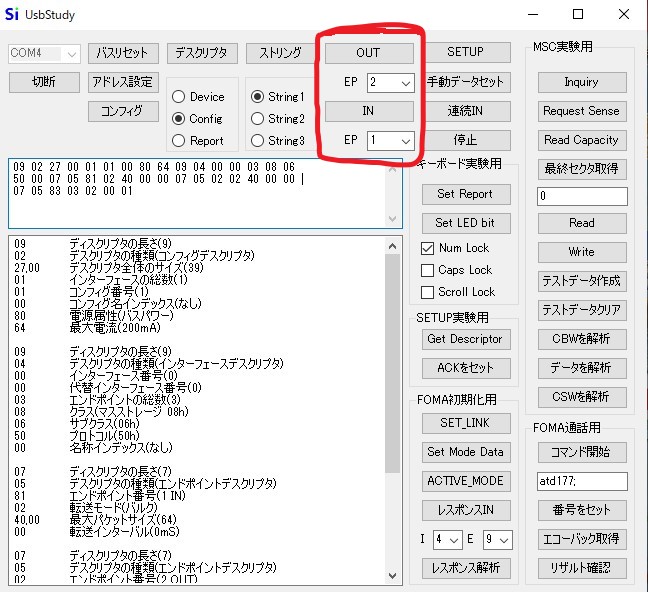 | インターフェース・ディスクリプタ | 9 | インターフェイスの情報で、インターフェースが持つエンドポイントディスクリプタの数を持ちます |