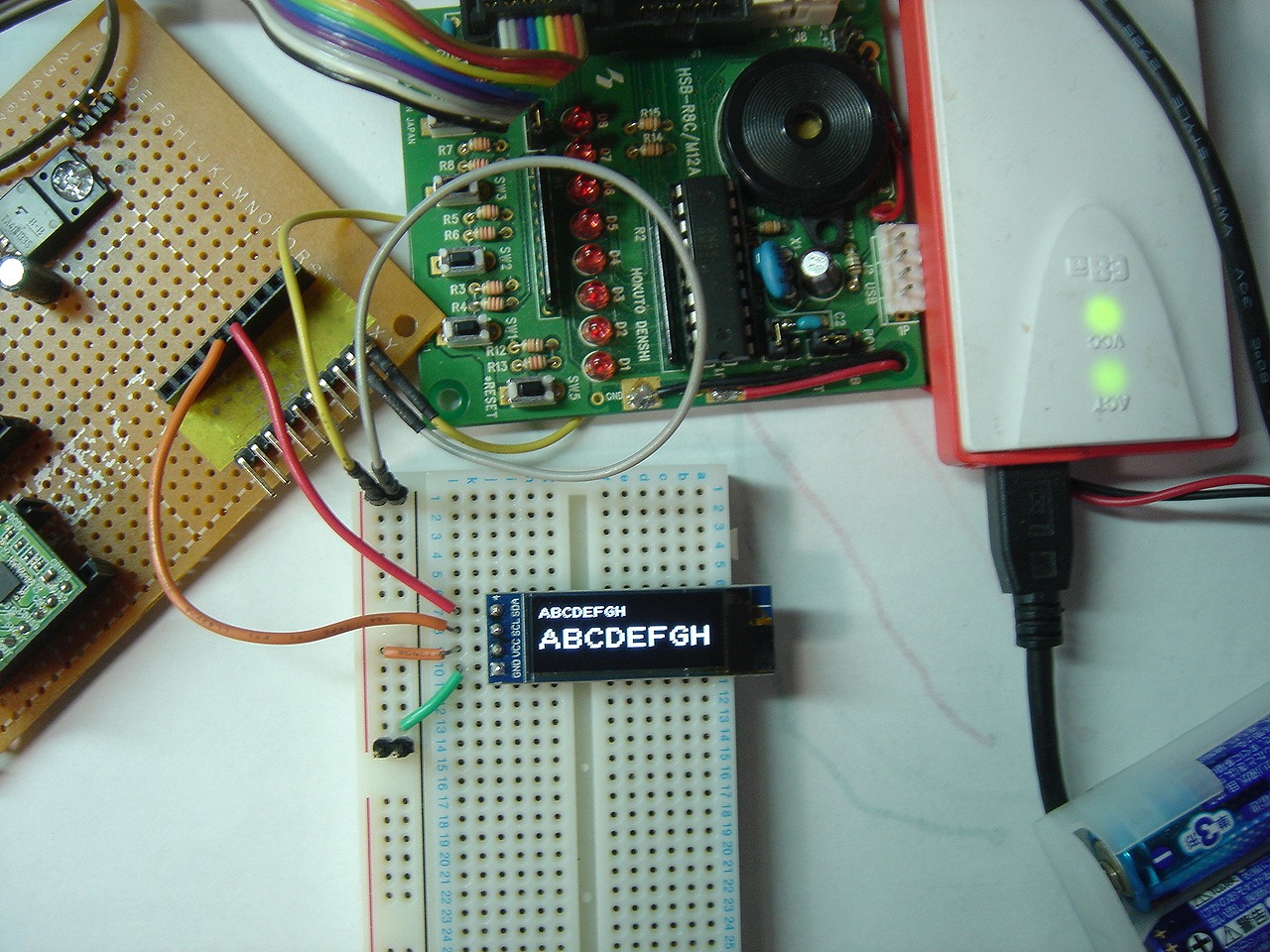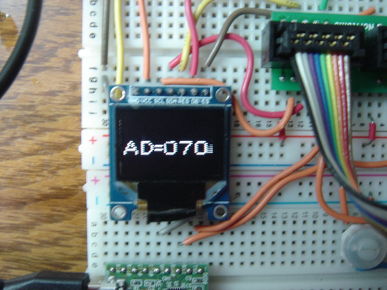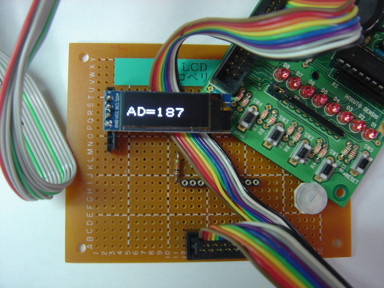 下の写真は可変抵抗値をAD変換した値をOLEDに表示する例ですが、縦横2倍表示させています。描画速度が遅いのが気になります。