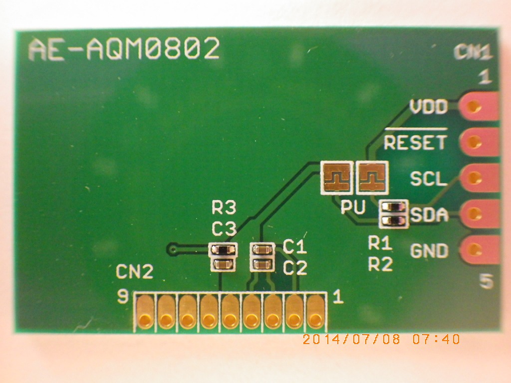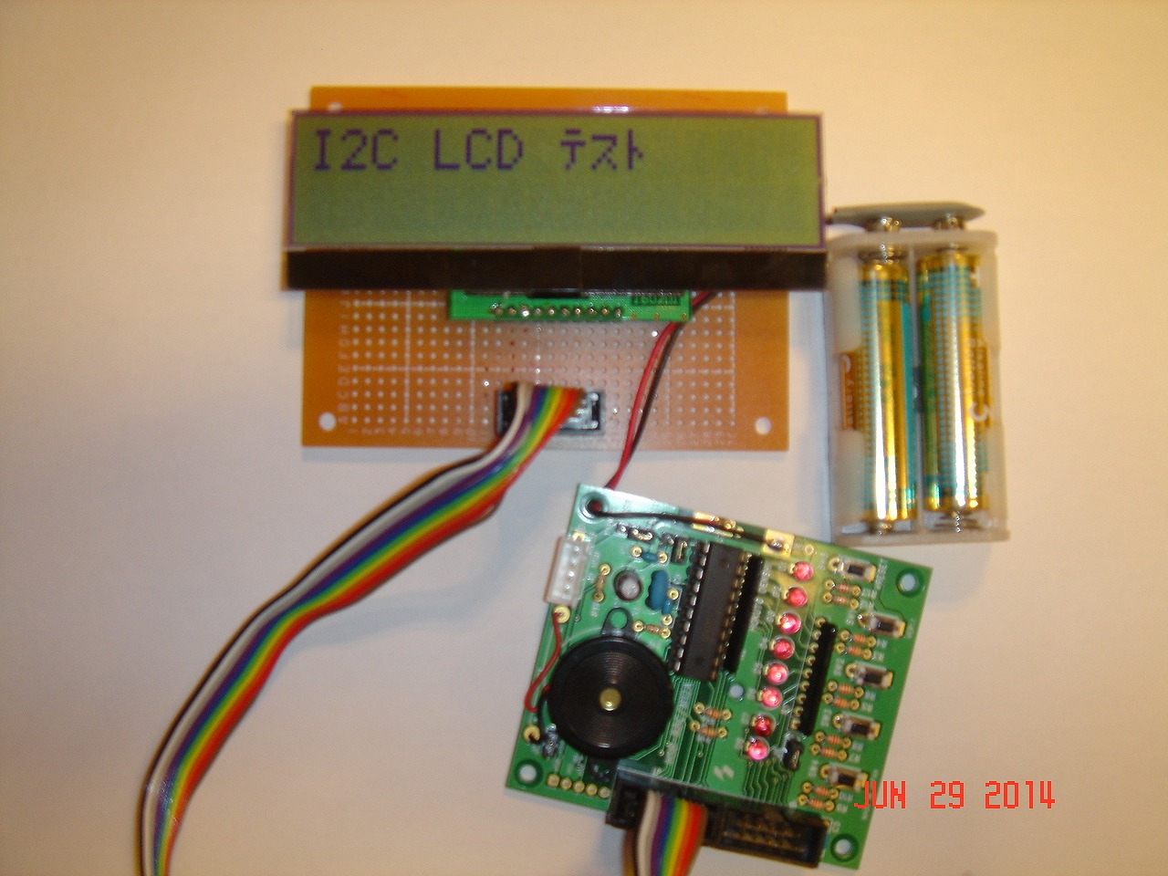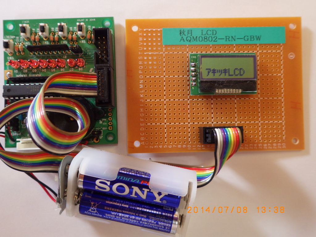 I2CインターフェイスLCD、秋月のAQM0802−RN-GBW(8文字x2行)を制御します。コントローラはST7032iを使っており、同じコントローラを使っているストロベリーリナックスのLCDでも同じように制御可能です。