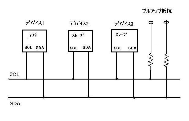 I 2 C バス仕様およびユーザーマニュアル)で、数10cm以内の同じ基盤上のデバイス間で、1台のマスターと1台以上のスレーブとの間をSCL(Serial Clock Line)とSDA(Serial Data Line)の2本の信号線の状態の組み合わせで行う通信方式です。