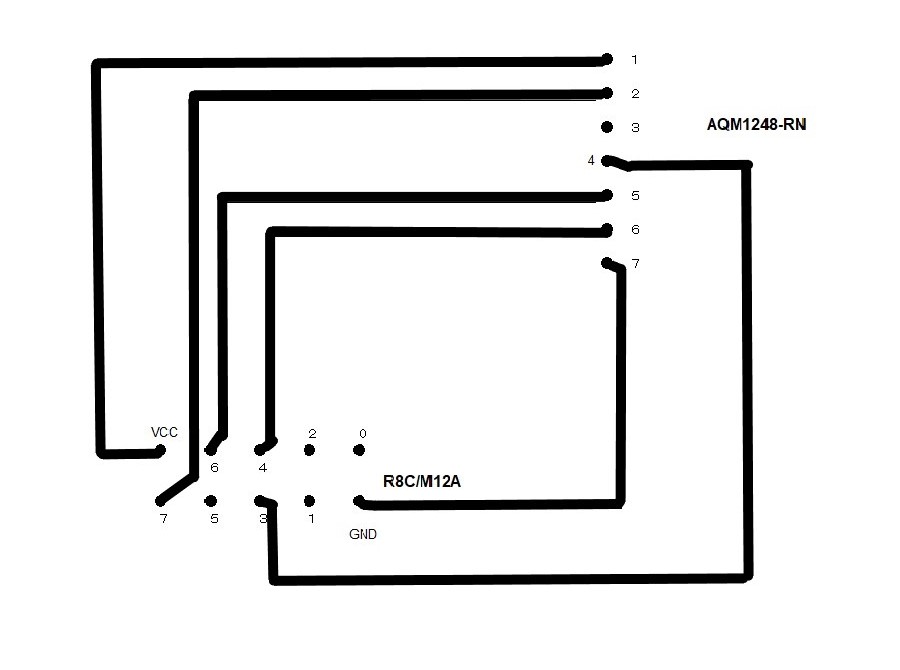 多くのSPI接続のグラフィック液晶が各社から販売されています。 マイコンカーラリーのホームページにR8C38で秋月電子のSPI−LCD、AQM1248-RNを扱ったプログラムが紹介されています。| AQM1248−RN側 | R8C/M12側 |